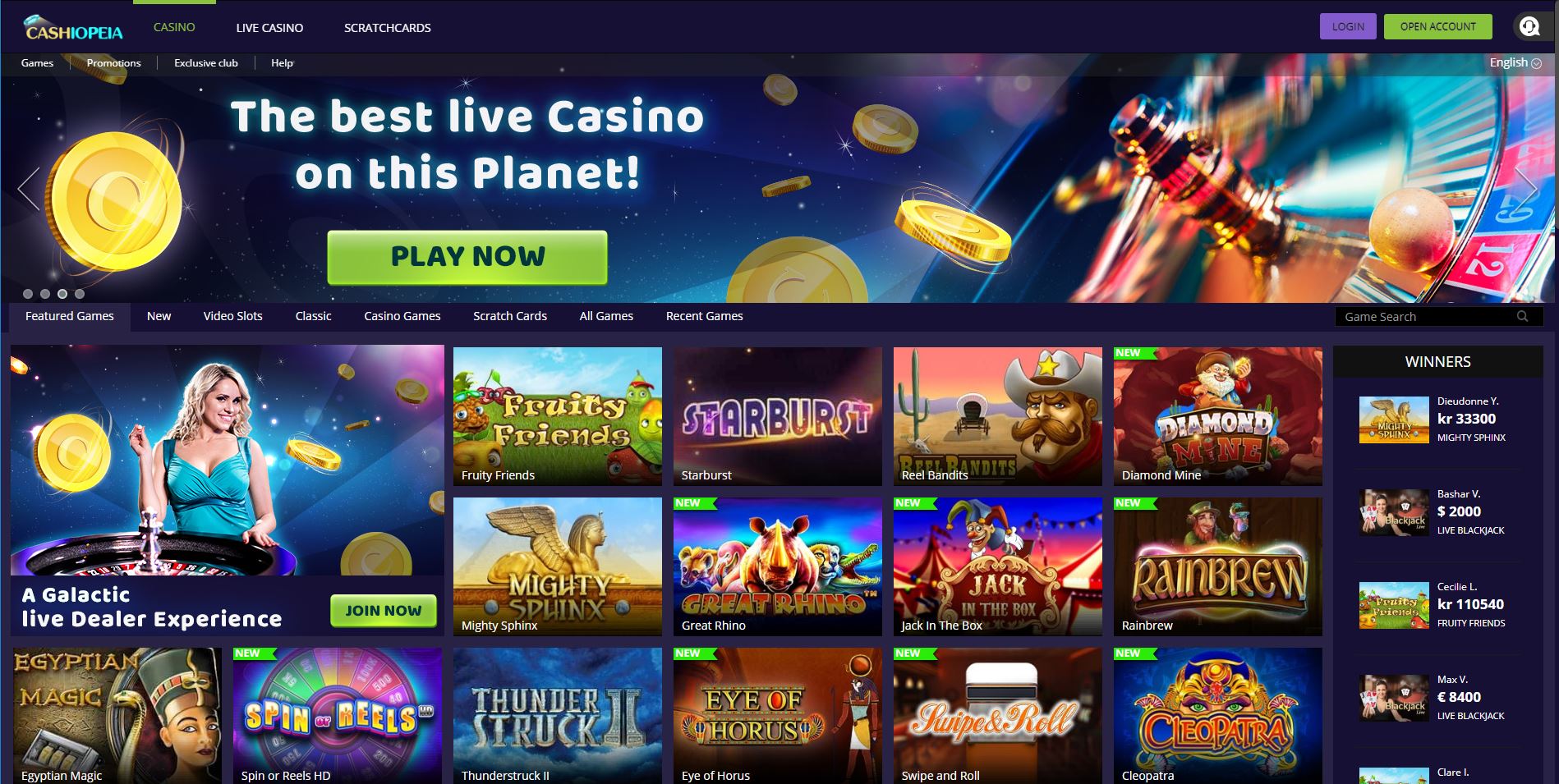 Alle Nederlandse casino'sCashiopeia is een buitenaards casino. Althans als we kijken naar de lay out van dit casino komt het zo over. We zien ruimtereizigers, aliens en rakketten. Wanneer je het casino opent stap je in de raket omhoog. Ondanks het thema ruimtereizen is het een heel aards casino met een heel goed spelaanbod en een heel dik welkomstpakket. Naast de verschillende casinogames verrast Cashiopeia ook nog met leuke kraskaarten.